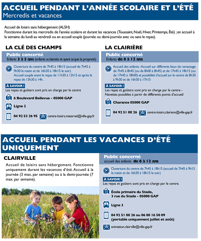 La ville de GAP et son CCAS accueillent vos enfants sur 3 Centres de Loisirs sans hébergement, en fonction des âges et des périodes.