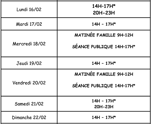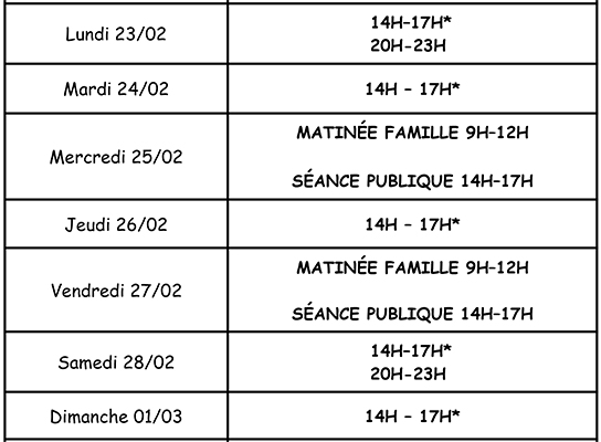 | Samedi : | 14h – 17h ** + 20h30 – 23h |