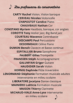 ensemble instrumental Versatiles, orchestre d’harmonie, choeurs du Conservatoire (enfants, ados, adultes), ensemble de guitares, ensemble à vents, ensembles à cordes