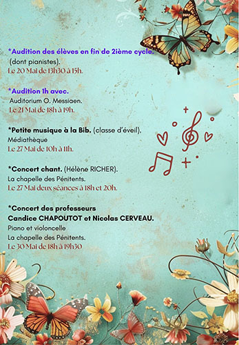 - Spectacle de fin d’année des classes d’instruments et de chant.